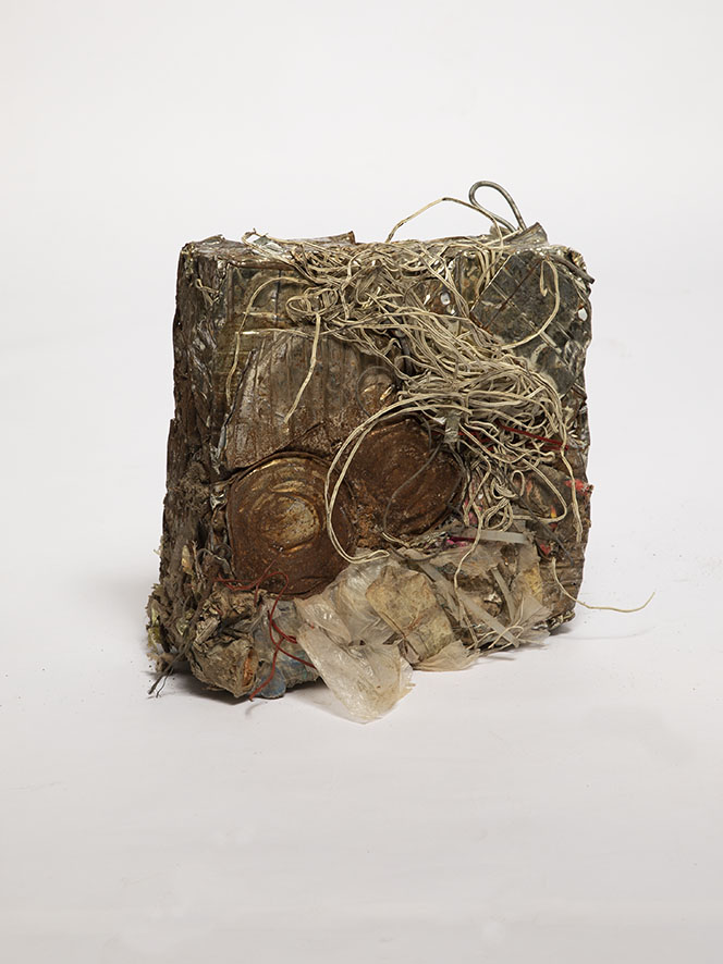 Sandra Kranich, Compact Time, 2012, aus der Serie: Compact Time, Metallplastik: Leiter, Zünder, verbrannte Feuerwerkskörper u.a. Objekte gepresst, Objekt: 33 x 33 x 14 cm