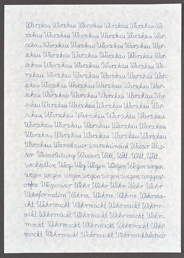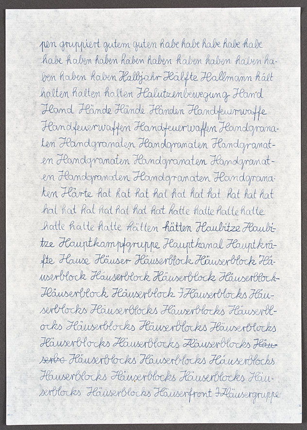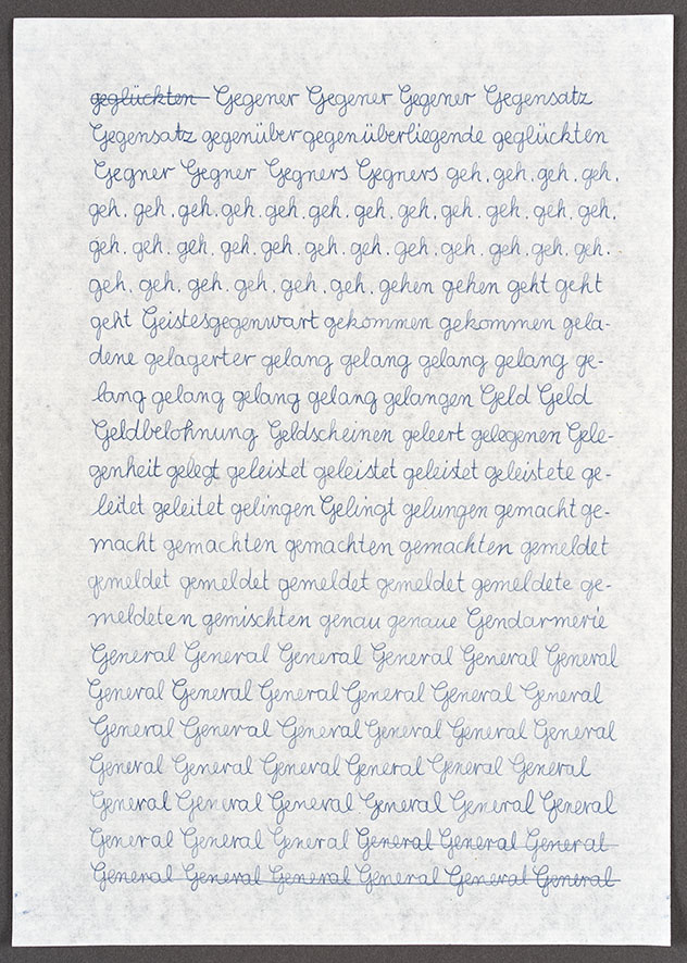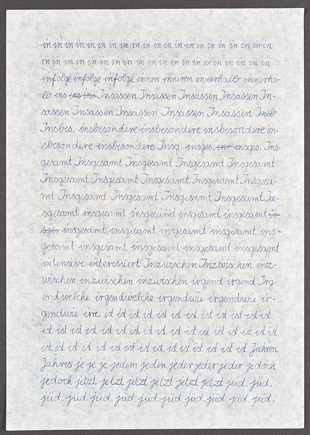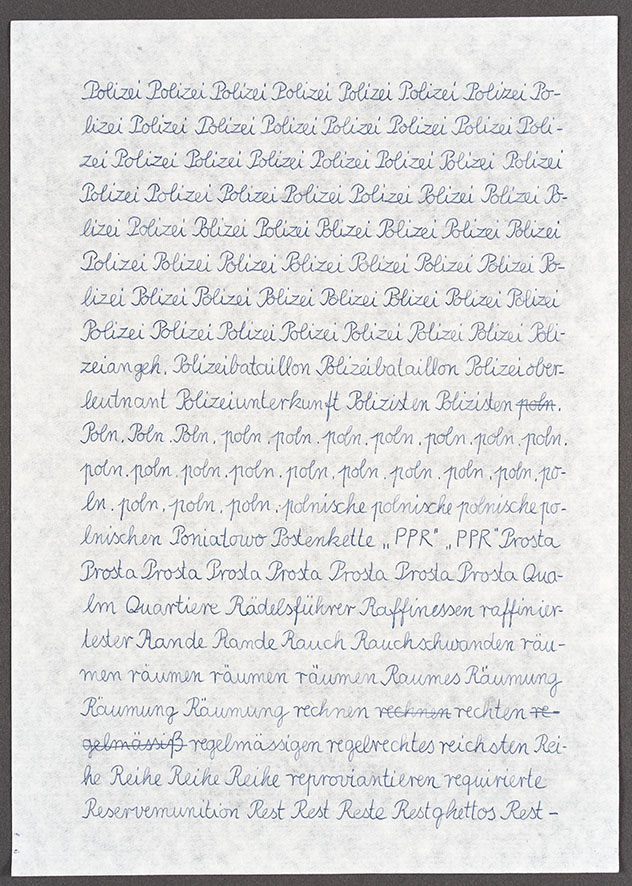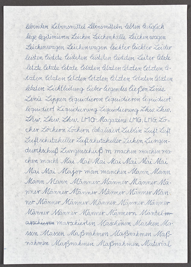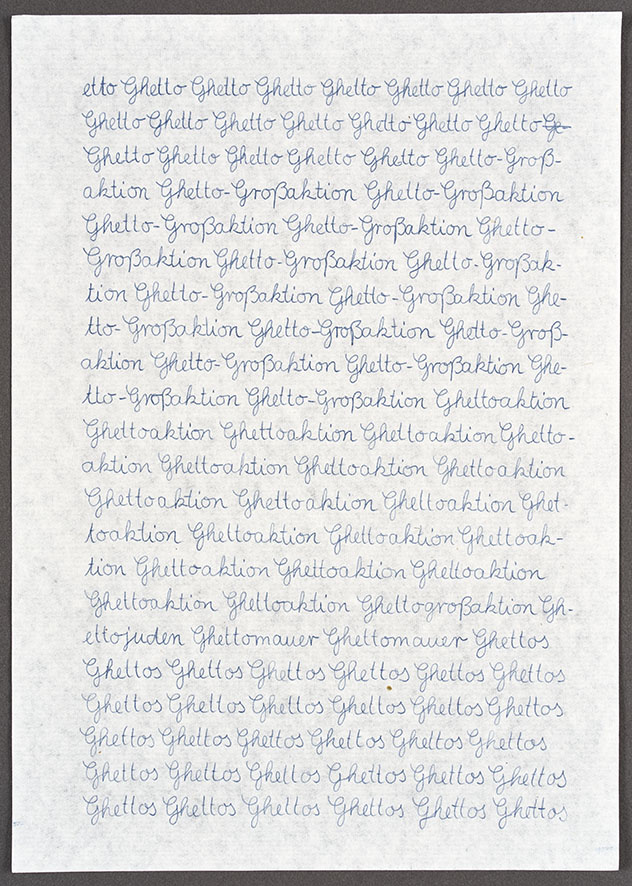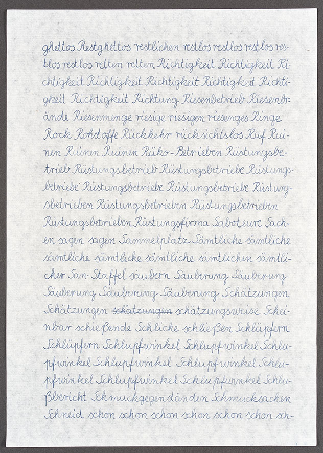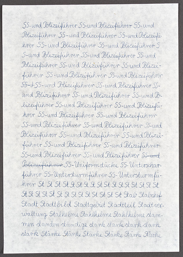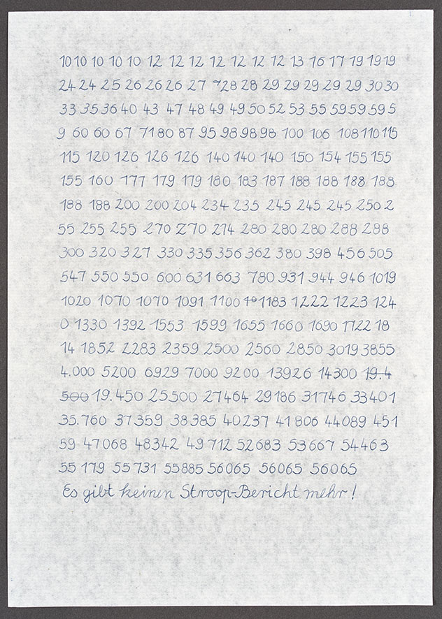 Tatiana Lecomte, Es gibt keinen Stroop Bericht mehr!, 2017–2018, Tableau 82-teilig, Durchschriften auf Durchschreibepapier mit Kohleschicht, Blatt: je 29,7 x 21 cm, Installation: 278 x 406 x 15 cm