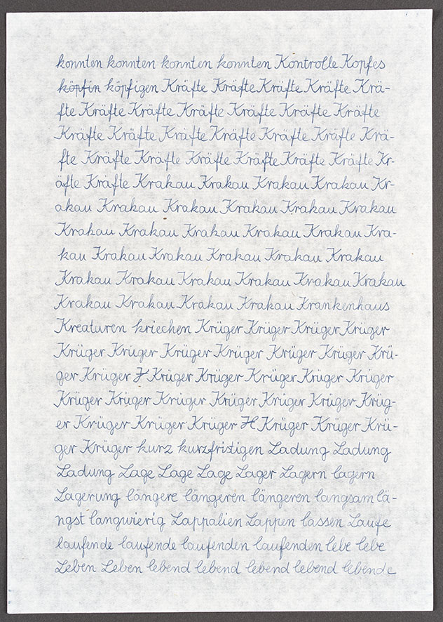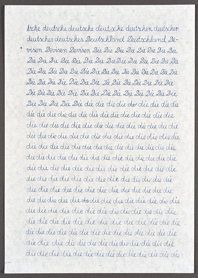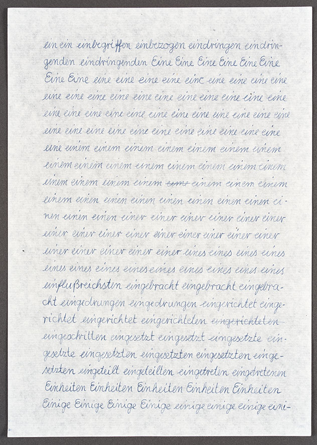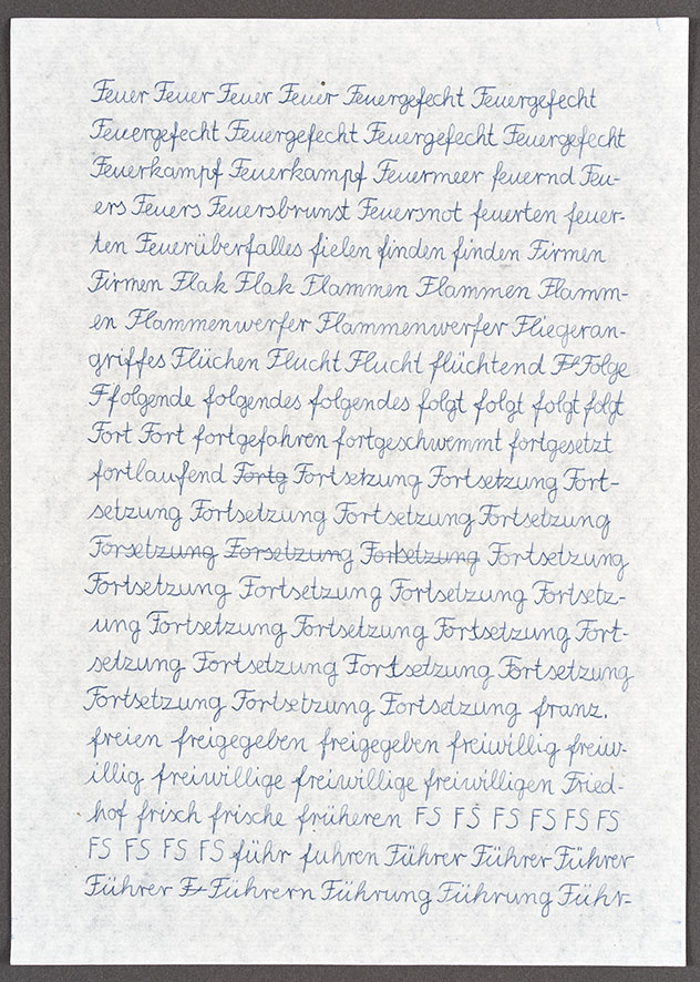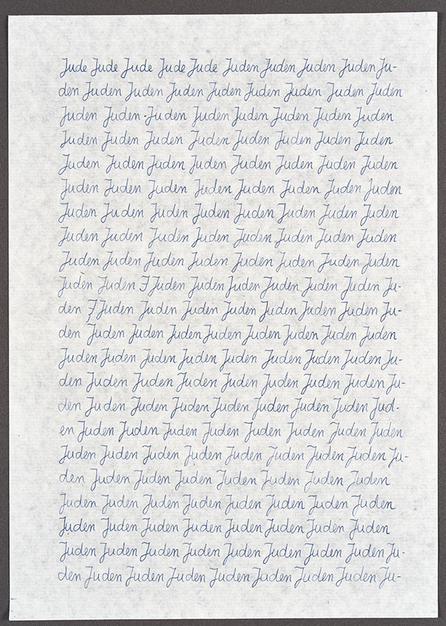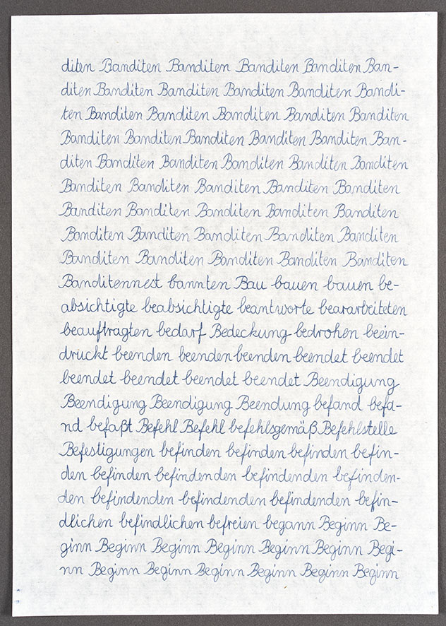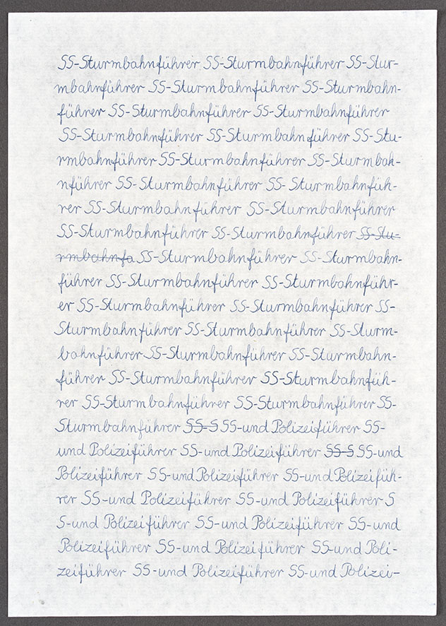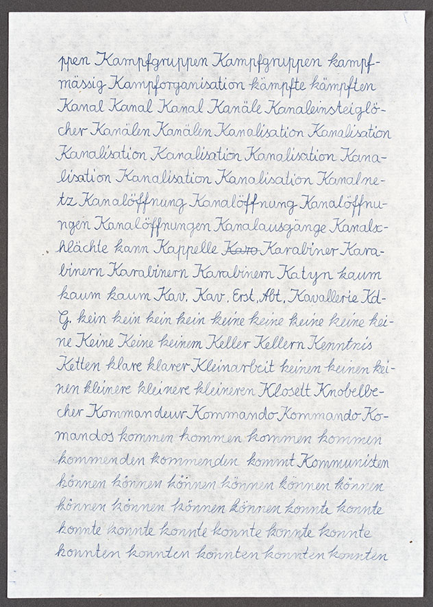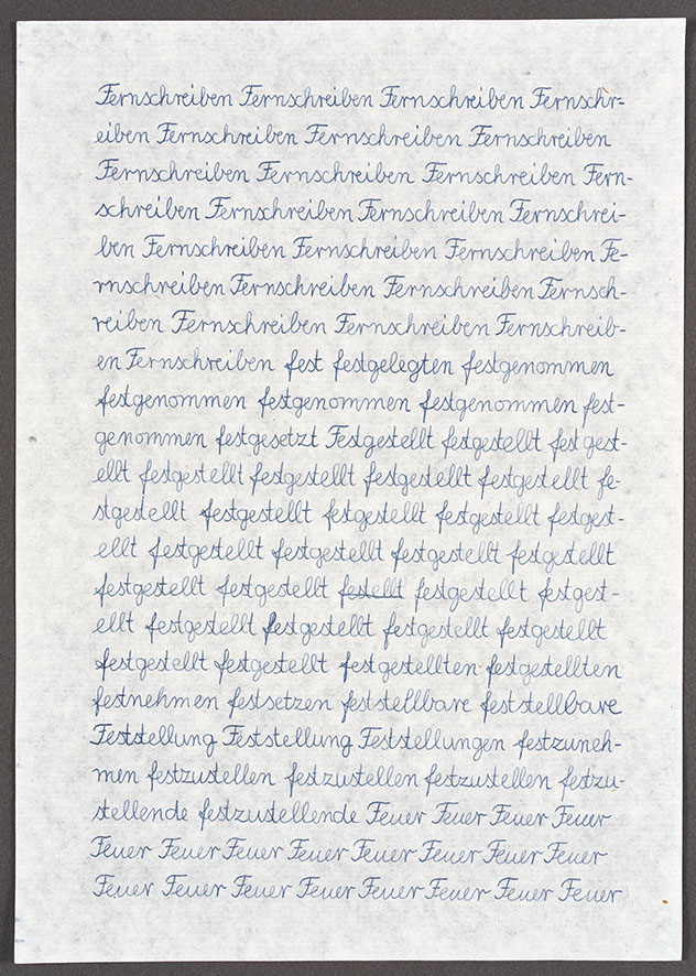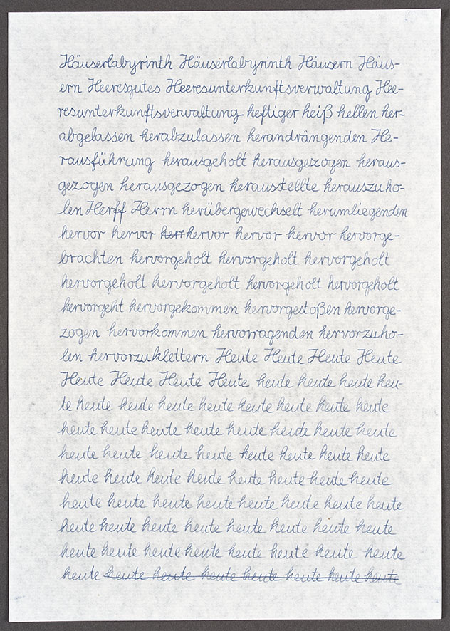Tatiana Lecomte, Es gibt keinen Stroop Bericht mehr!, 2017–2018, Tableau 82-teilig, Durchschriften auf Durchschreibepapier mit Kohleschicht, Blatt: je 29,7 x 21 cm, Installation: 278 x 406 x 15 cm
