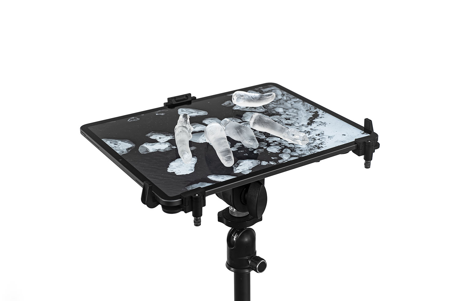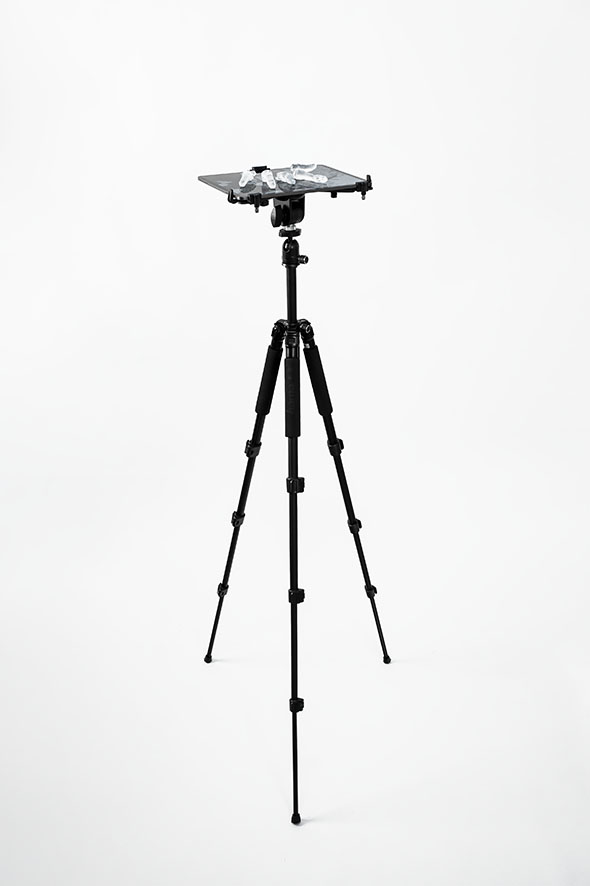 Lena von Goedeke, Exposition II, 2021, Stativ, iPad, Halterung, 5 Finger aus Uranglas, Video, Installation: ca. 115 x 23 x 30 cm, Laufzeit: 00:04:51